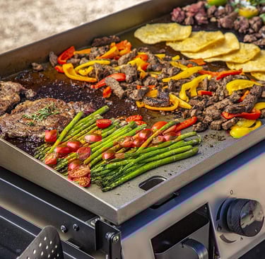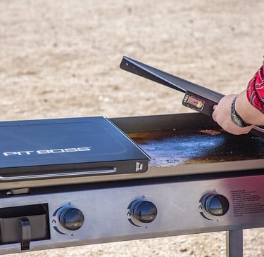 A flat-top grill or outdoor griddle expands your menu options well beyond burgers. Think breakfast spreads, stir-fries, and smash burgers—all cooked quickly and evenly. Breakfast hash browns cannot be replicated anywhere else but on a griddle. Also when we do burgers, this is a must have, easy to maintain and pumps out the food in a hurry. Pit Boss is our go to for griddles and smokers (more on that later). Links are in the pics.