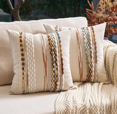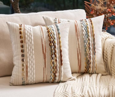 Same rules apply here as does the throws. You want to try and avoid any synthetic materials as heat or one rouge ember can ruin your pillow and ultimately be a fire hazard. We suggest cotton or wool to provide a bit more protection from embers. We love the Aeckself Bohemian Pillow covers, they go great with the Rattan style rug above and really bring the natural tones together with a little pop of color. https://amzn.to/3Ipc7p5