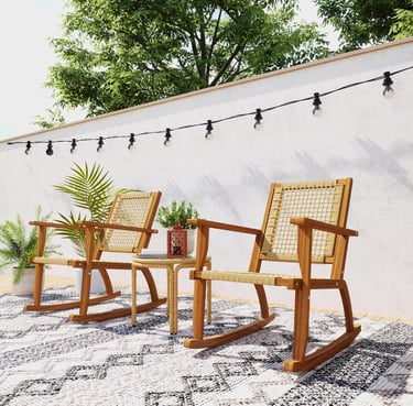 Wicker and Rattan are timeless and scream outdoors and summer. We absolutely love these solid acacia wood rocking chairs with rattan woven backs and seats. These are as stylish as they come. https://amzn.to/3Ip6yab