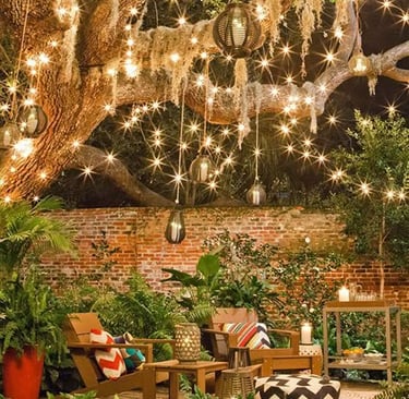 String lights draped through branches or pergolas