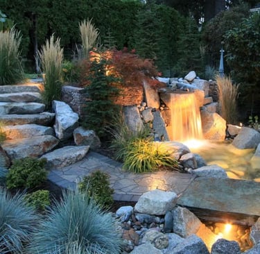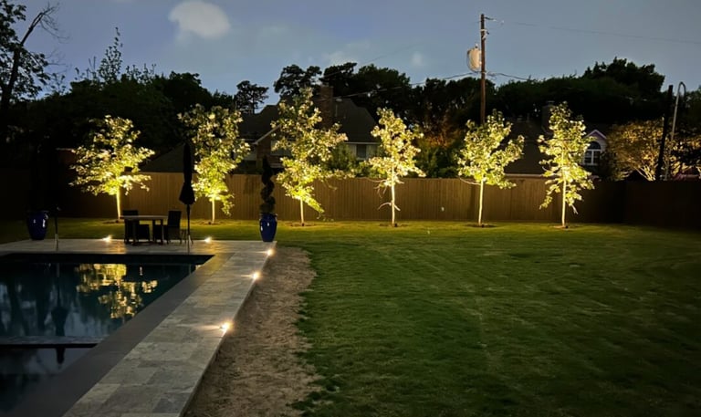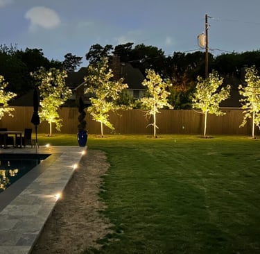 Uplighting adds drama by casting light upward onto trees, shrubs, or structural features like a trellis or wall. It’s a powerful way to add depth and dimension after dark. Uplighting trees and shrubs is a very easy way to illuminate dark corners of the yard to make backyard spaces more inviting. Try utilizing RGB (RED, GREEN, BLUE) lighting for custom lighting options and holiday charm.